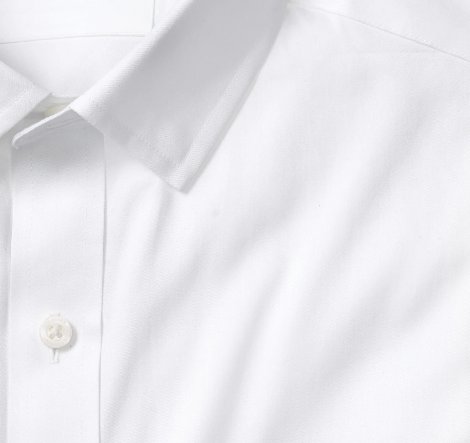 - Point collar with hidden buttons for stay-in-place smoothness.Â