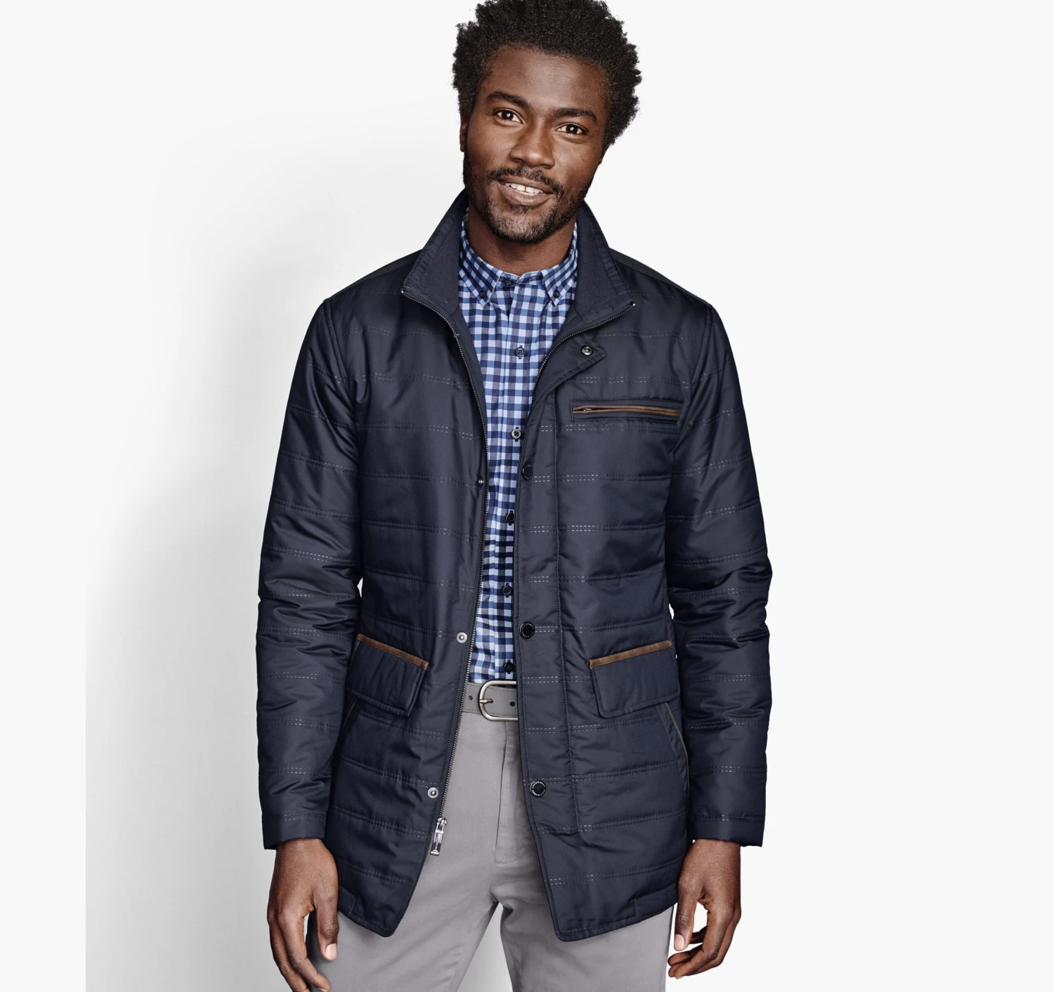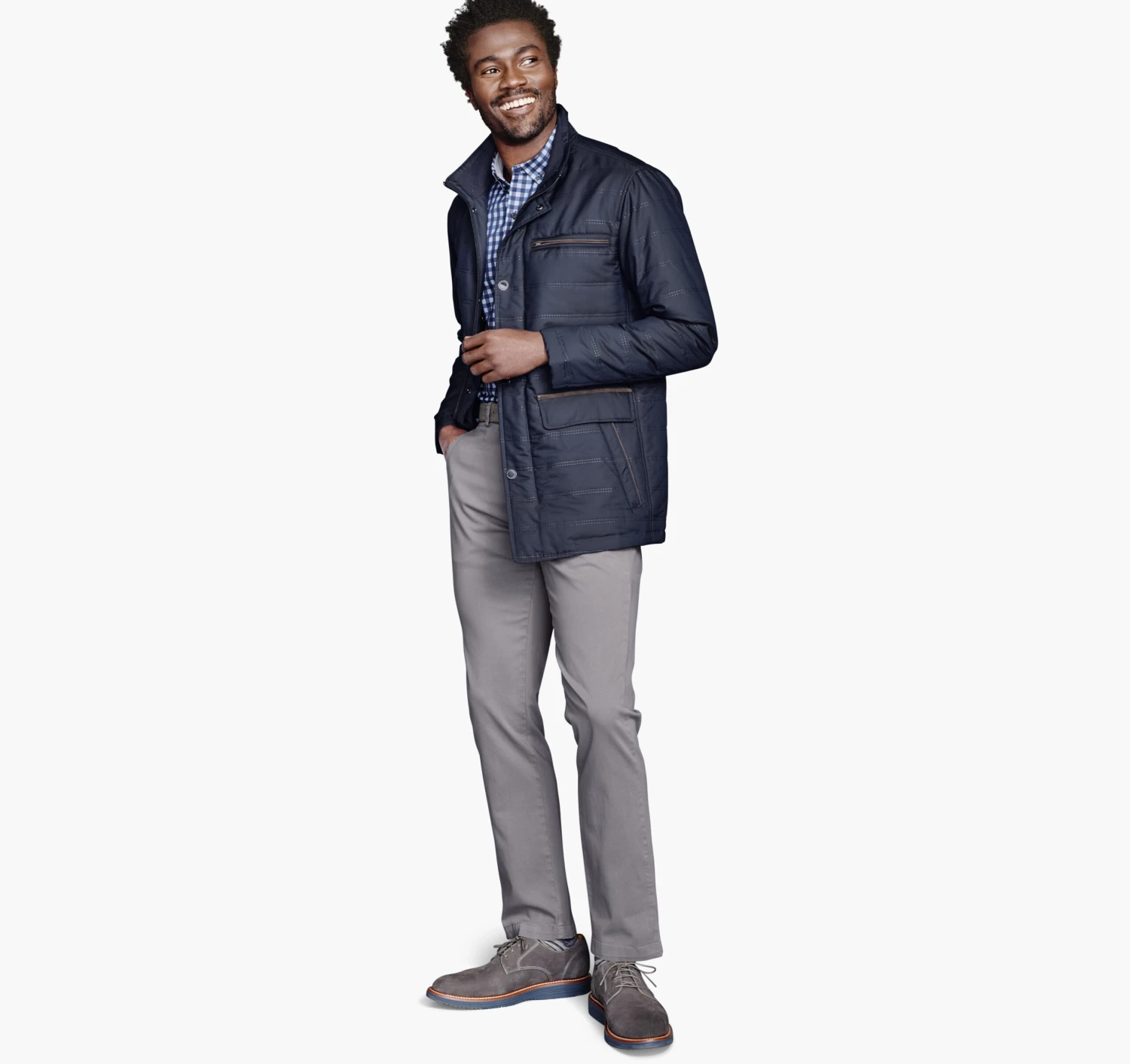 - Zip chest pocket; dual-entry front pockets.