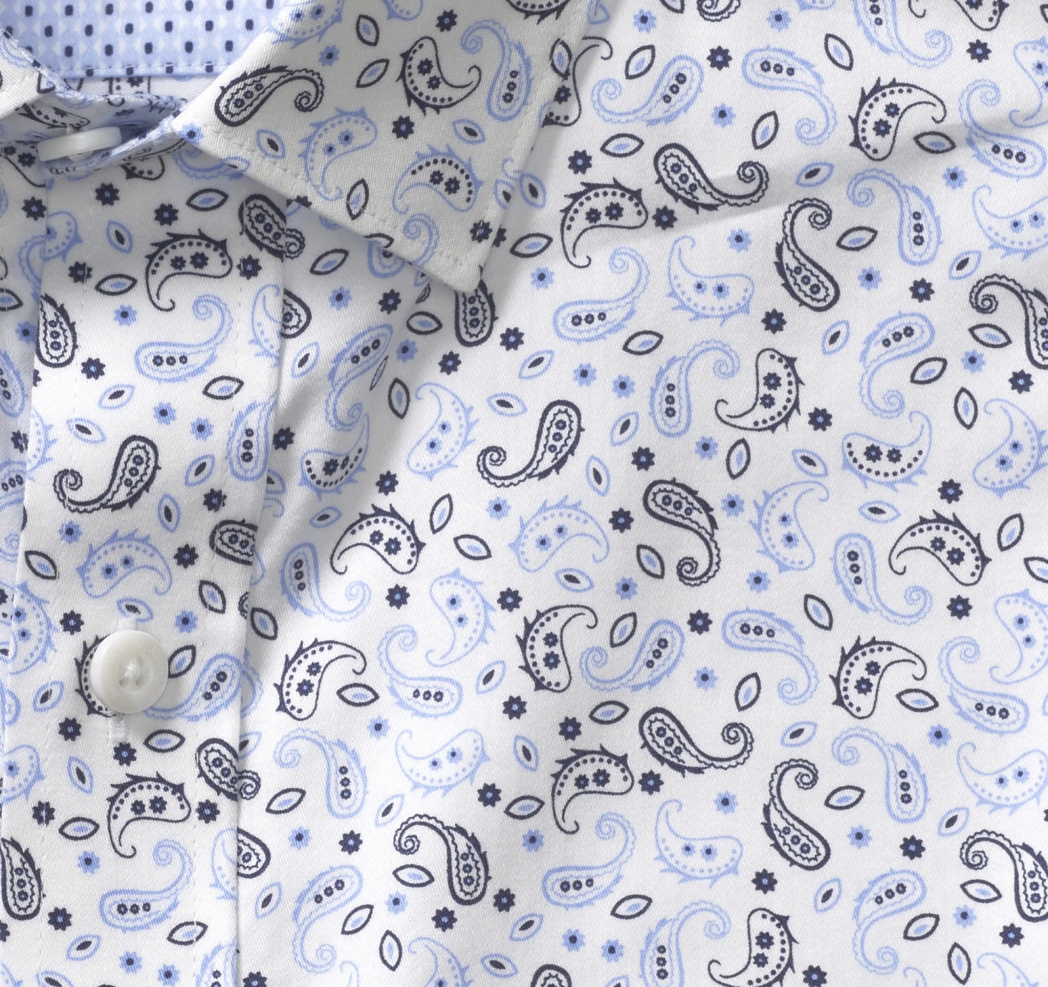 - Point collar with hidden buttons for stay-in-place smoothness.