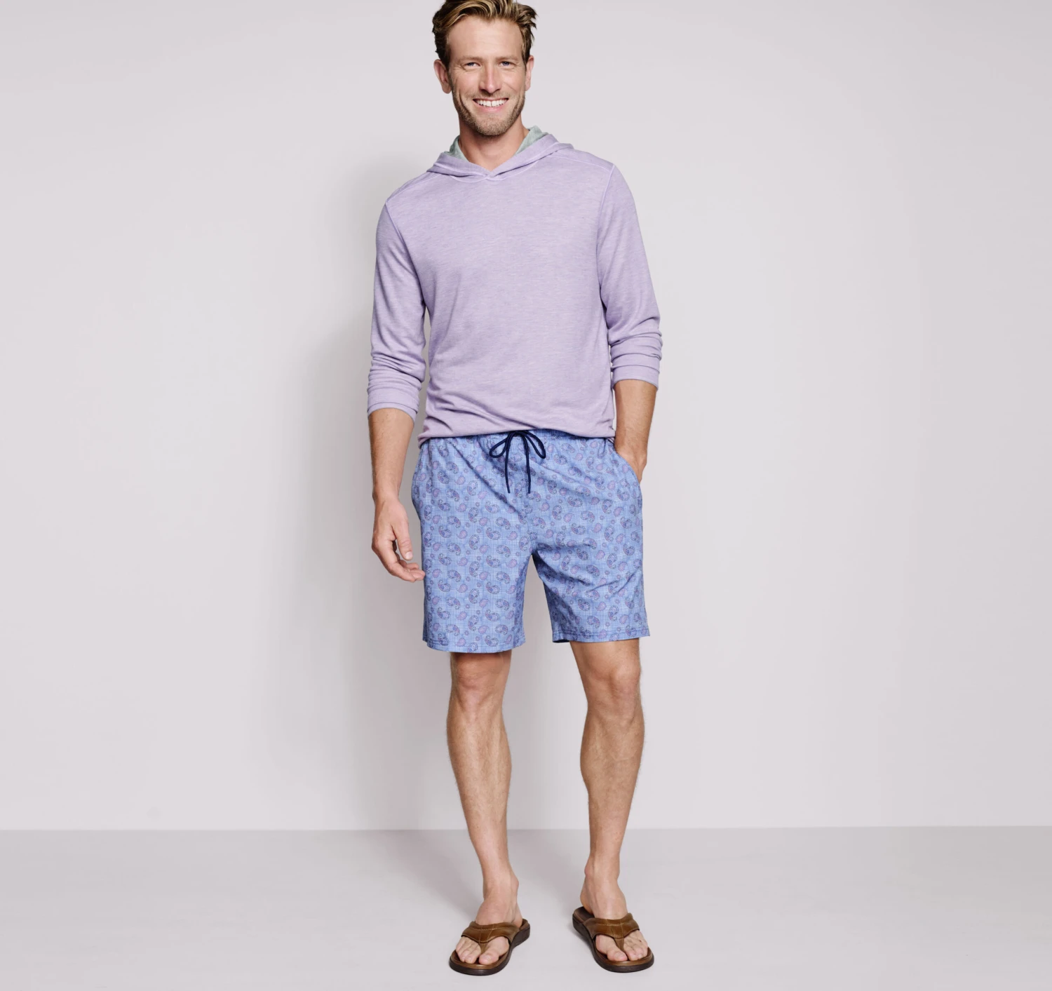 - Soft, lightweight double-faced knit reverses to contrast heathered shade.