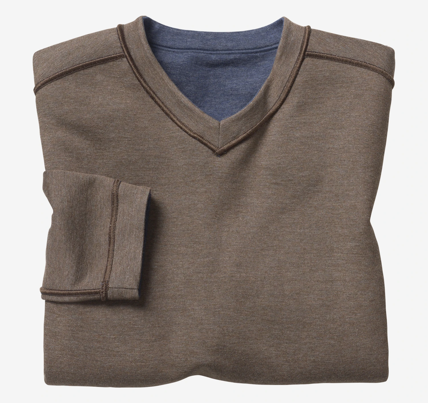 - Soft, lightweight double-faced knit reverses to contrast heathered shade.