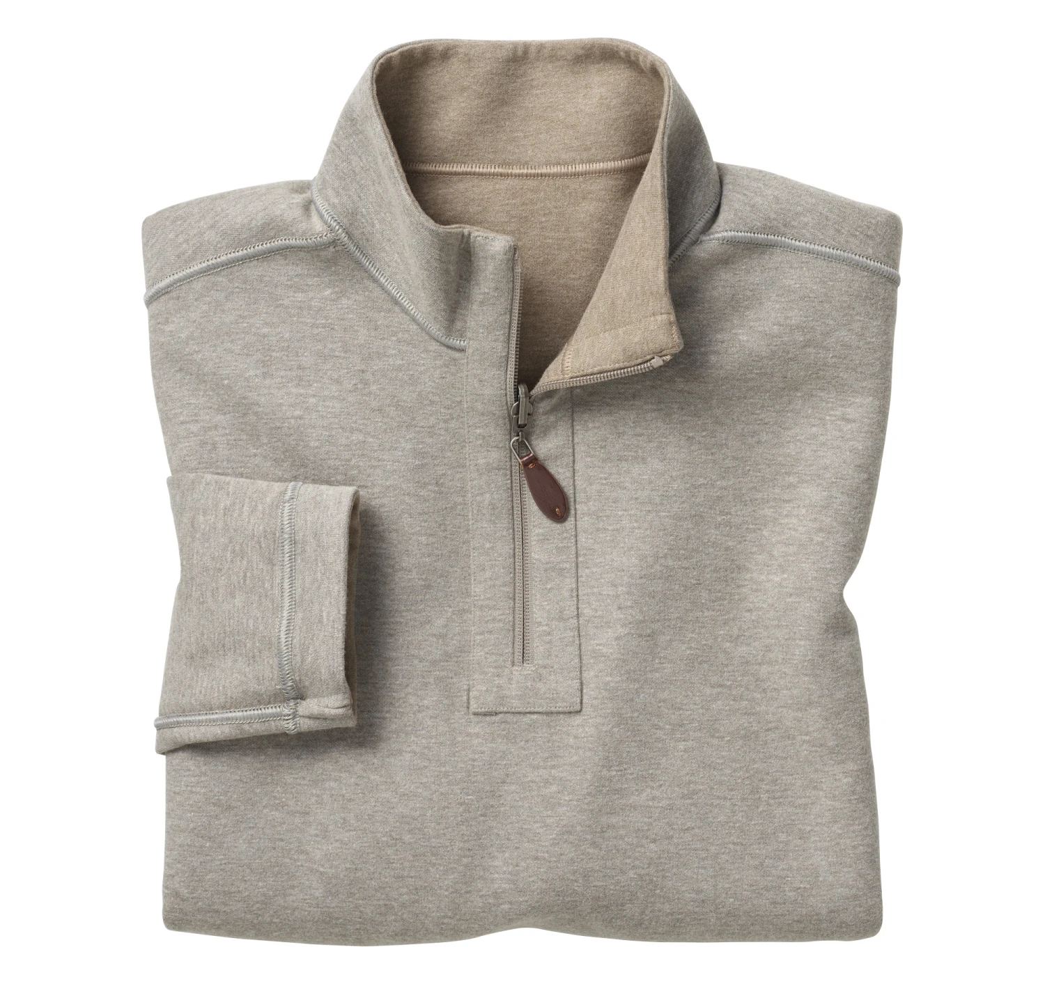 - Soft cotton-blend knit reverses from solid to coordinating heather shade.
