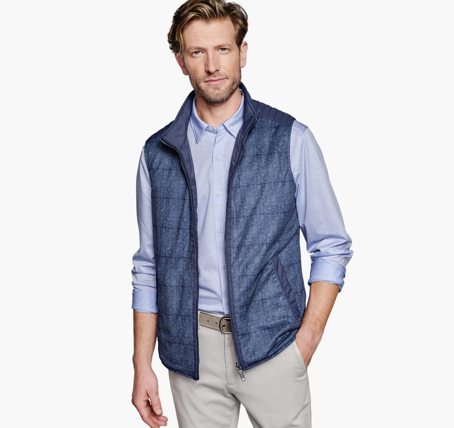 - Quilted woven side reverses to a menswear stretch knit.