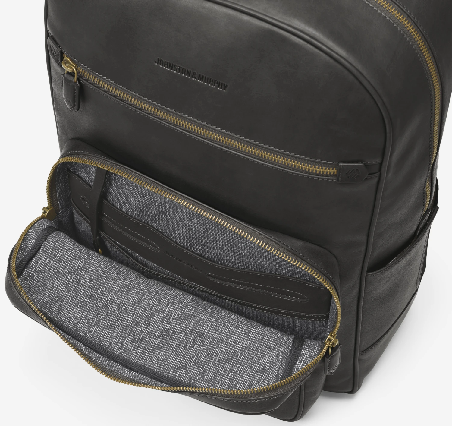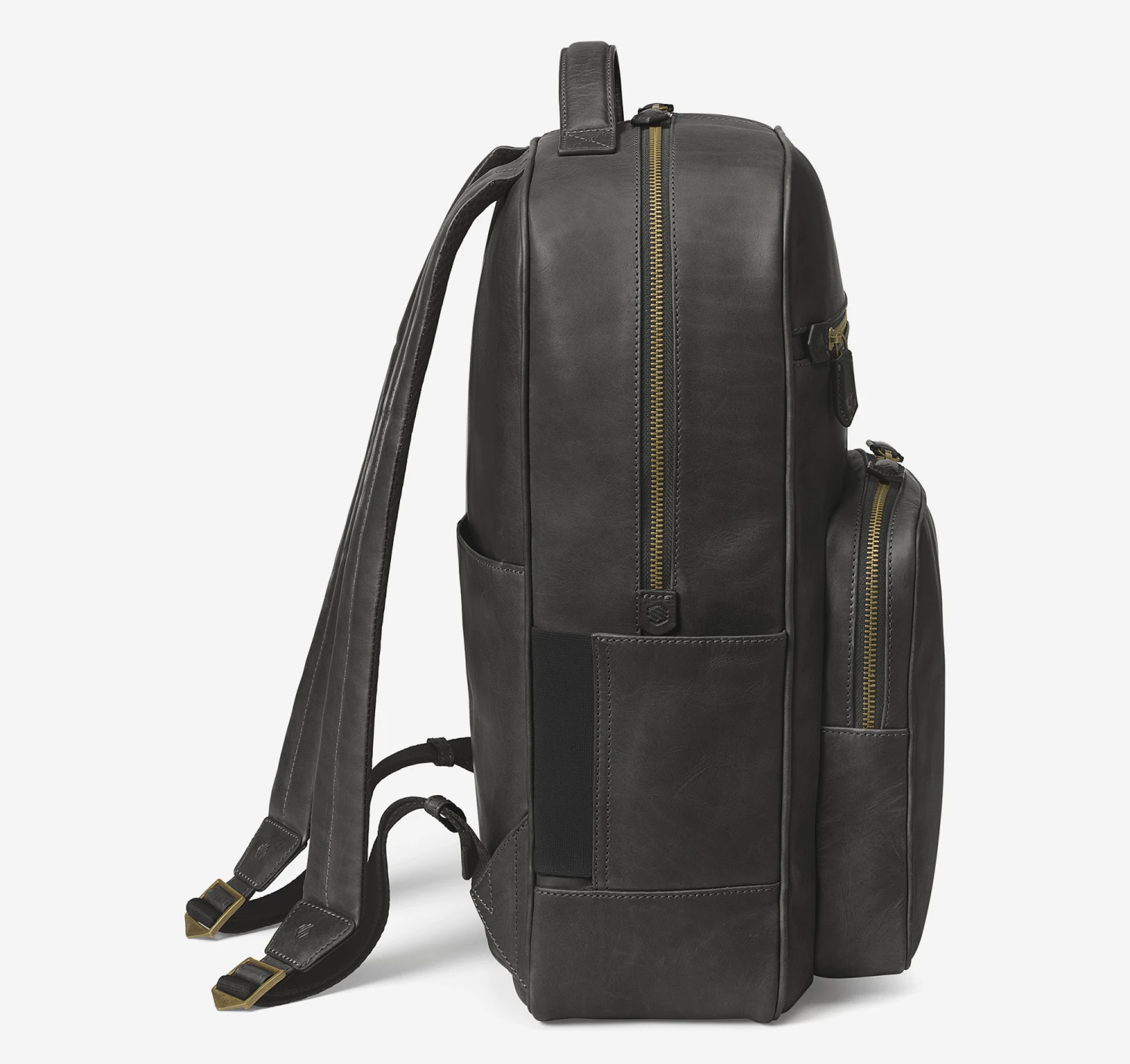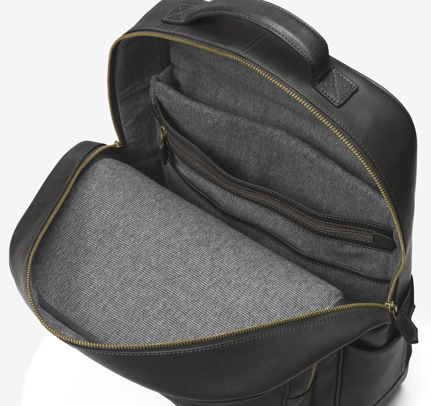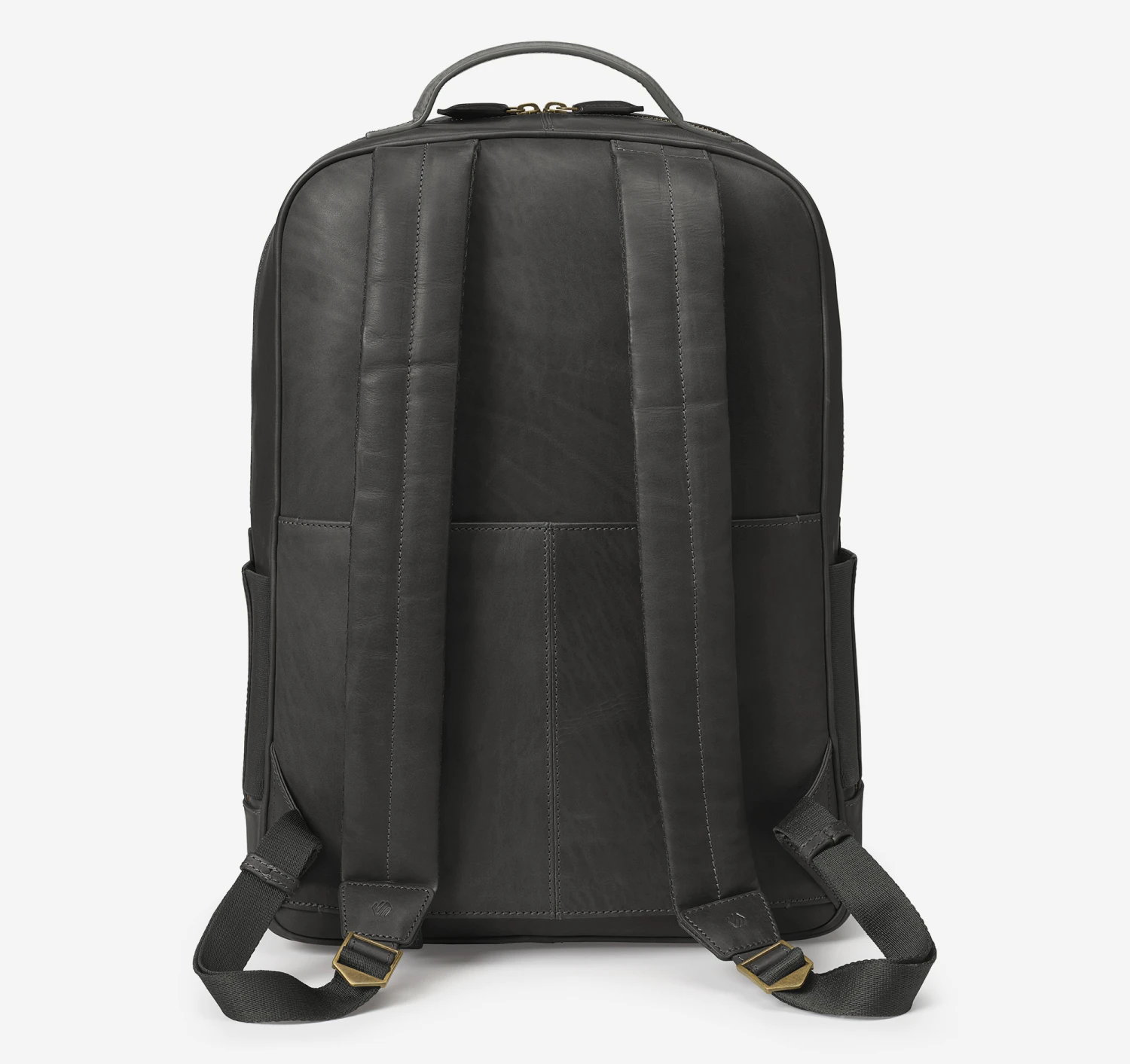 - Padded, adjustable leather backpack straps with non-slip finish.